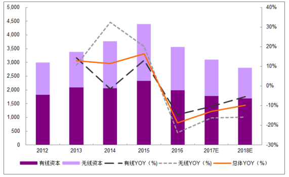 网络建设按照''光纤光缆-传输网-无线网''的投资顺序进行。目前5G尚且处于试验与承载网建设时期,预计2018年运营商资本开支仍处下行周期,整体下滑幅度减缓,其中受传输网建设影响,有线资本下滑预计将收窄明显。