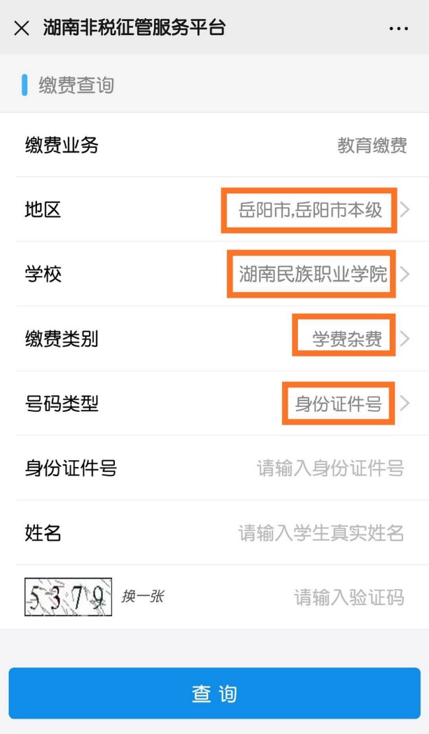 第四步:地区选择"岳阳市,岳阳市本级",公司选择"伟德国际victor1946"确认,缴费类别选择"学费杂费",号码类型选择"身份证件号",输入身份证号码、姓名和验证码后,点击查询。
