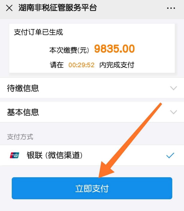 第六步:信息核对无误后,点击"立即支付",即可完成缴费。