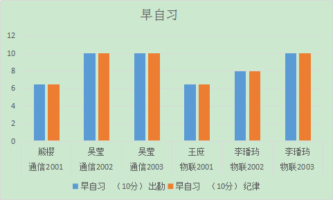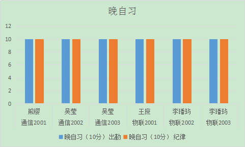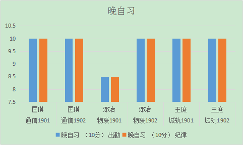从图表可以看出,通信2001班、物联2001班、物联2002班早自习出勤及纪律情况有待加强,晚自习物联1901班扣分较为严重,希望辅导员加强对员工的管理。
