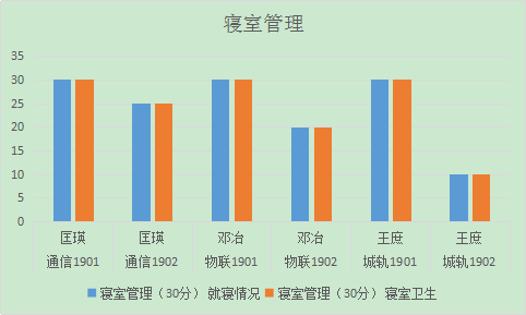 从图表可以看出,通信1902班、物联1902班和城轨1902班的寝室管理有扣分现象,特别是城轨1902班的扣分较多,由此可以看出寝室就寝情况和卫生情况存在较大问题。希望辅导员和各寝室的寝室长加强管理,督促到位。